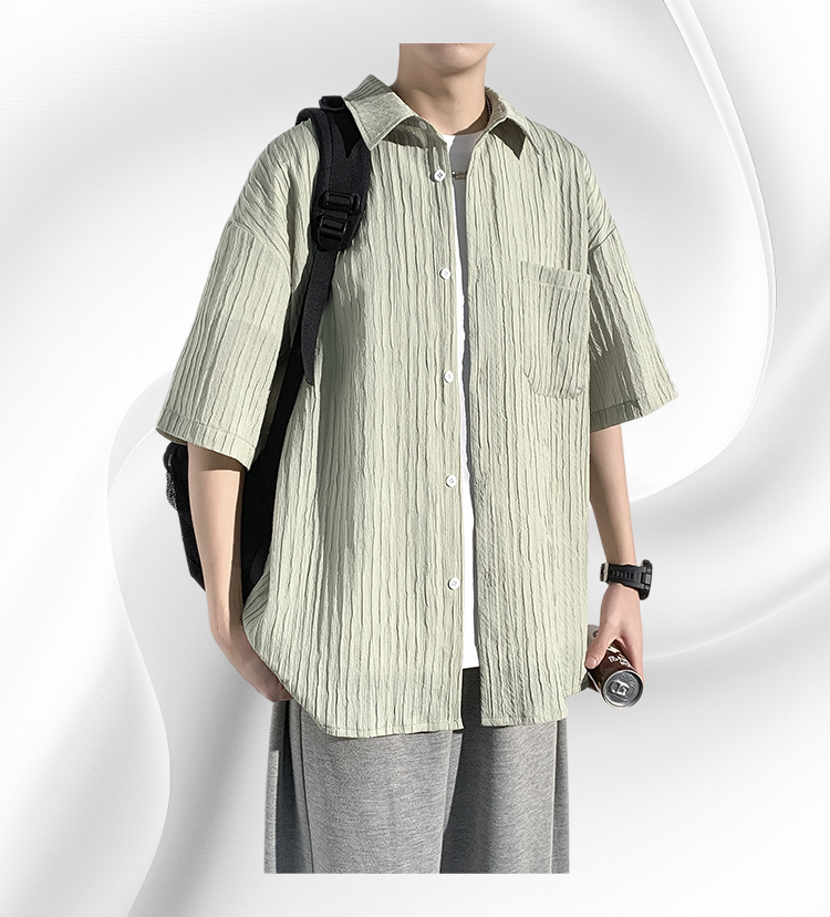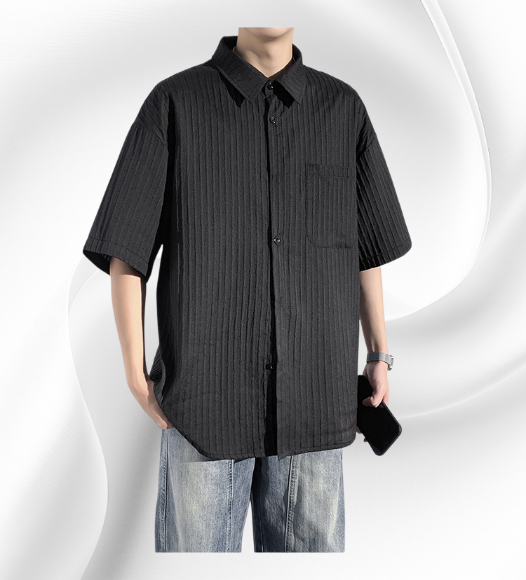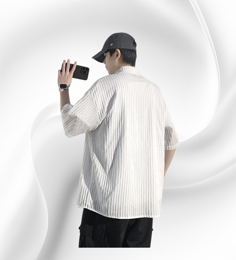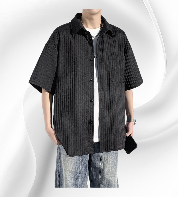 여름용 캐주얼 반팔 셔츠, 세로 스트라이프와 오픈카라 디자인, 질감 있는 소재, 루즈핏으로 편안한 착용감, 남성 데일리룩에 적합