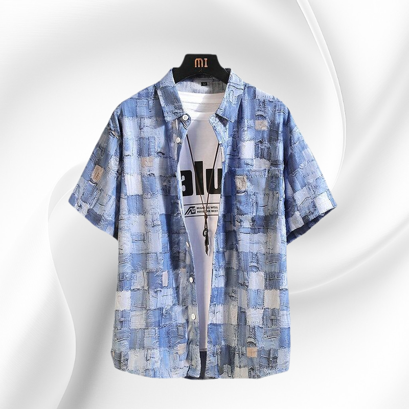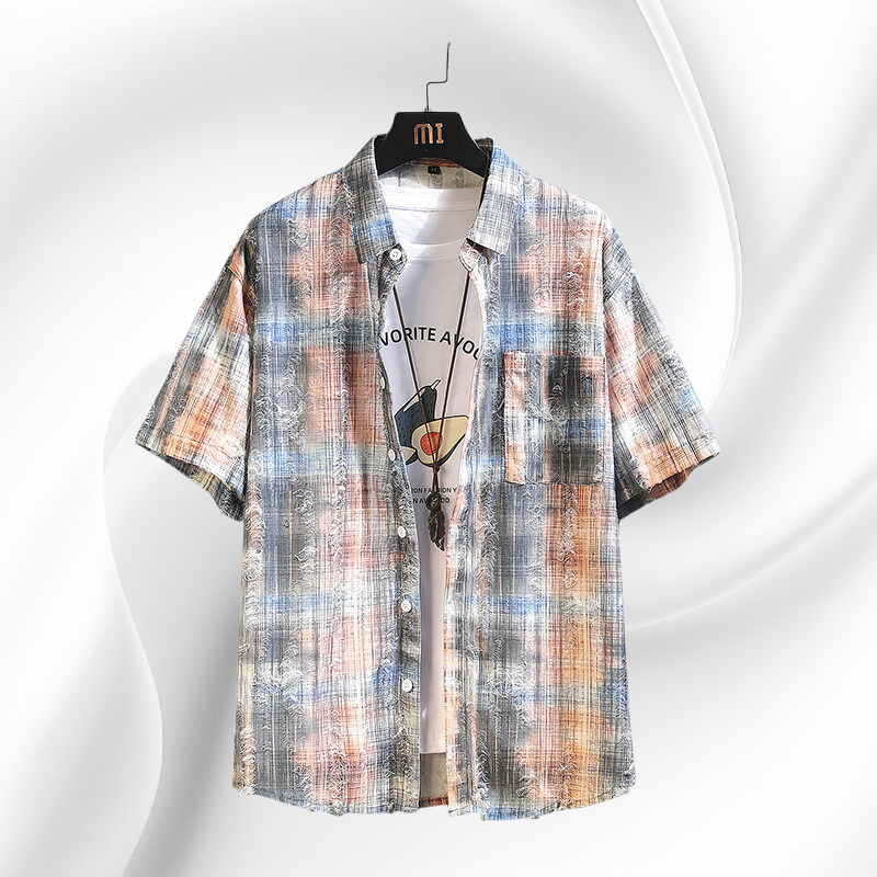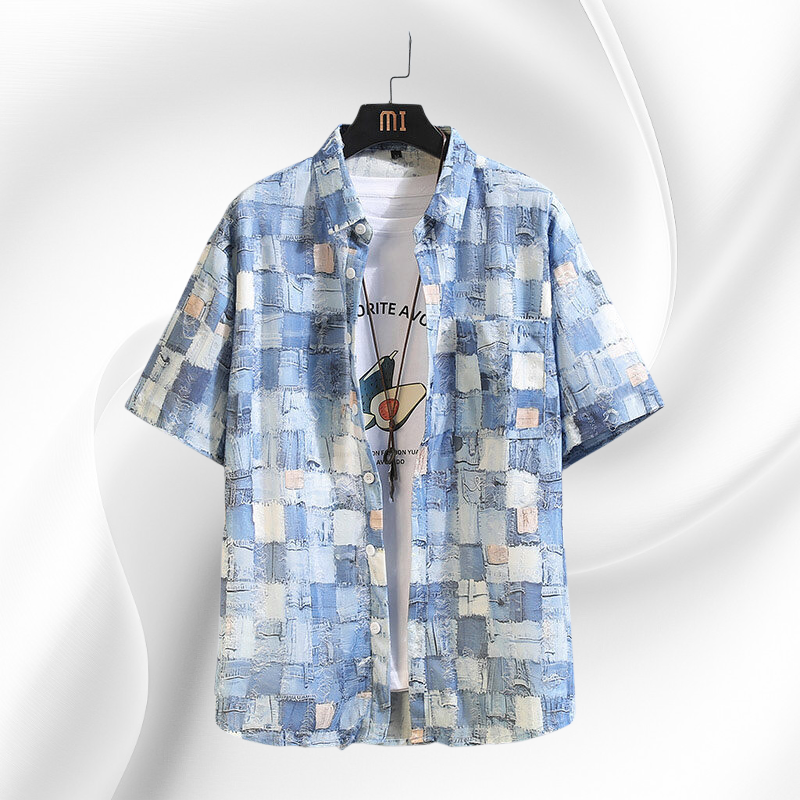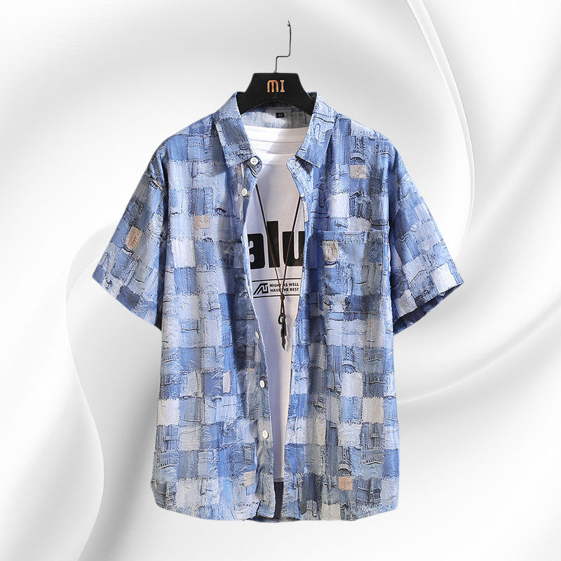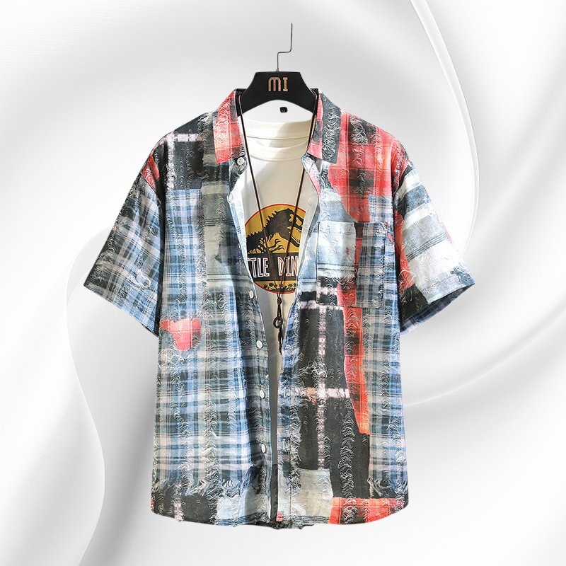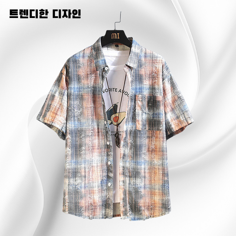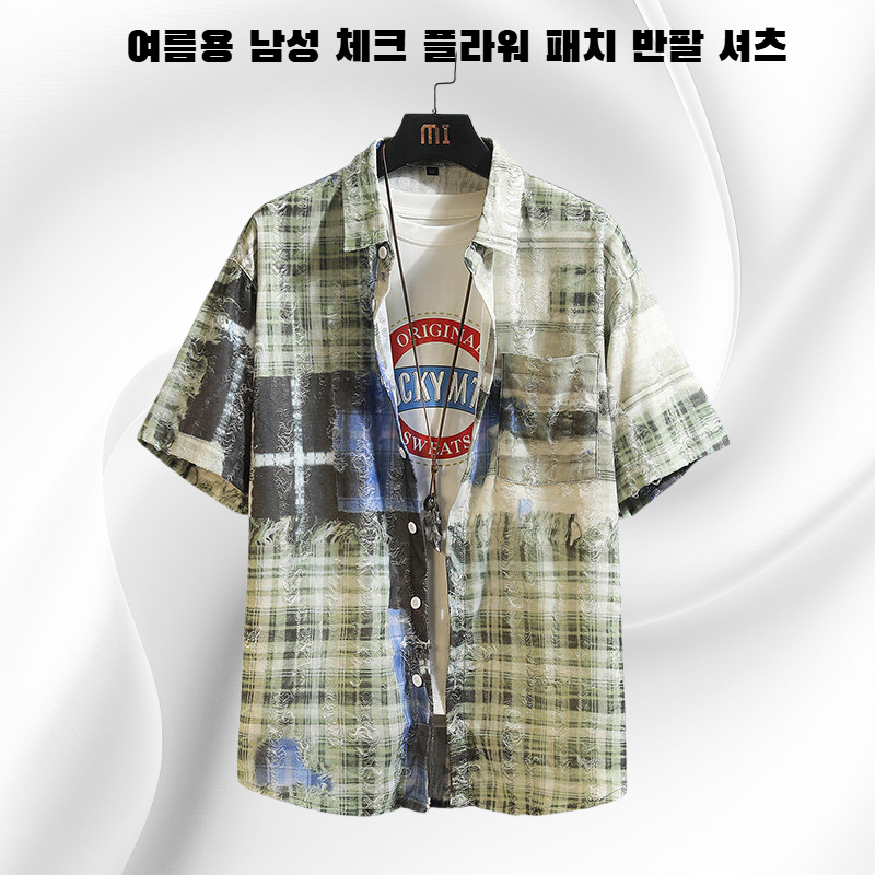 트렌디한 체크와 플라워 패치 디자인, 시원한 반팔 스타일, 다양한 여름 코디 연출, 가벼운 착용감, 남성 여름 아우터로 활용 가능