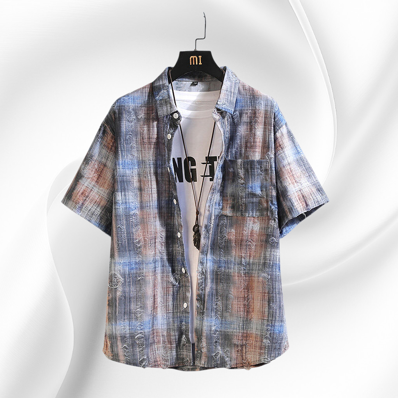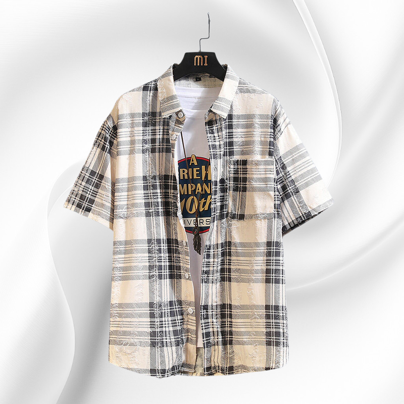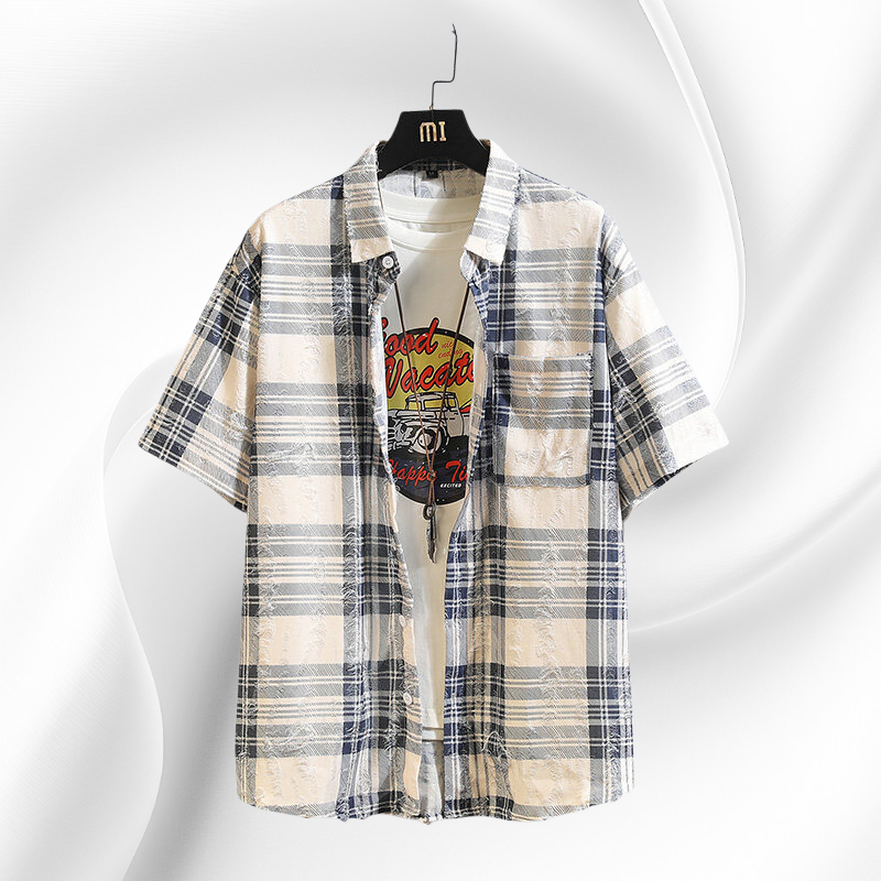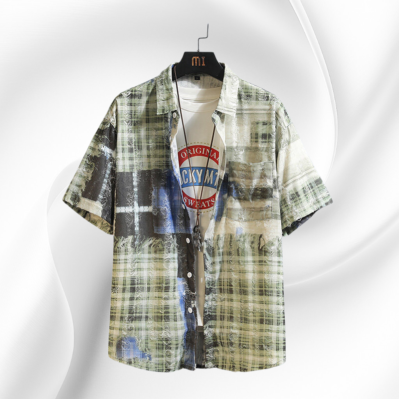 2025년 여름 신상 남성 체크 플라워 패치 반팔 셔츠 아우터